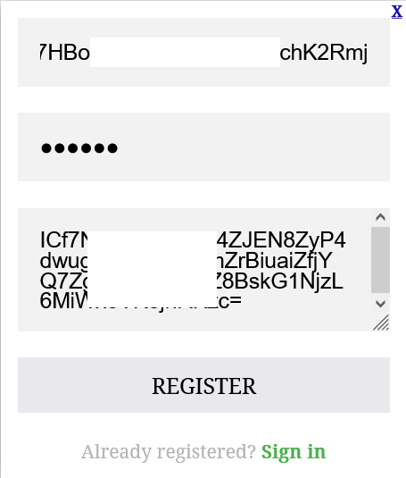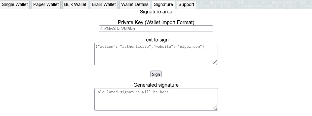 For "Text to sign" field use text {"action": "authenticate","website": "nigez.com"}.